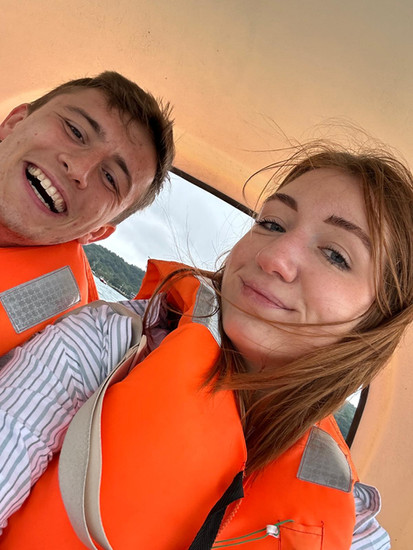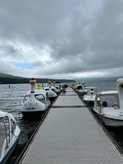 We parkeren de auto langs het meer en vragen bij een verhuurder om een waterfiets, maar dit wordt ons sterk afgeraden vanwege de harde wind. Ze hebben ook motorbootjes in de vorm van een zwaan, wat met dit weet beter zou moeten zijn. Prima, denken we, dan gaan we met een motorboot het meer op. Het enige nadeel is dat deze bootjes geen hoedje dragen (zeer belangrijk), maar dit zie je toch niet als je zelf in de boot zit. Achteraf gezien zijn we héél blij mee met deze keuze: alle mensen die we in waterfietsen zien, komen bijna niet vooruit, terwijl wij keihard voorbij razen. Na een halfuur hebben we het wel gezien en leveren we de boot weer in. Ik kan me voorstellen dat dit nóg leuker is met Mount Fuji op de achtergrond, maar wij hebben het alsnog heel erg naar ons zin gehad.